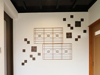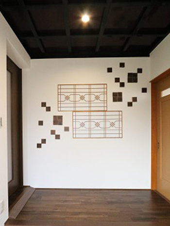 もともとあった障子の組子を玄関に入って正面の壁に取り付けました。デザイン性に優れた、おもてなしの空間です。