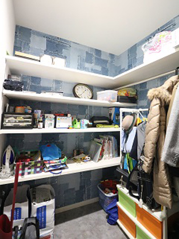 ご家族が増えることによって心配されていた収納量も、適所にクローゼットを設けることで解消しました。デニム柄の壁紙もお気に入りポイントです。